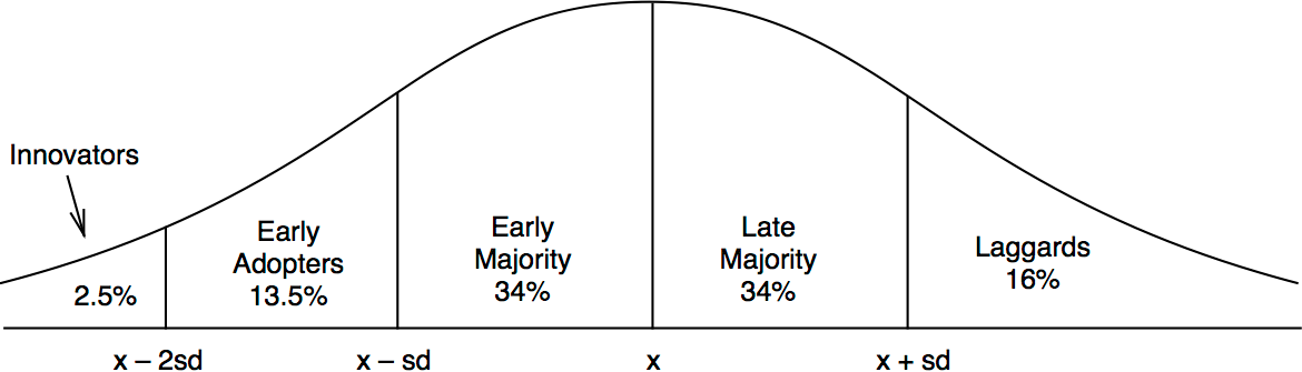 Based on the findings of several studies, Rogers uses a measure of “innovativeness” to distinguish different categories of adopters. Using the average time of adoption for a population and an individual’s time of adoption, the individual can be associated with one of the following five adopter categories. The boundaries between the categories are based on standard deviations from the average time of adoption (cf. Fig. 2).