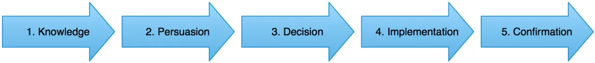 Similar to what happens in a marketing funnel, each stage in this process has the potential for the individual to reject the innovation, e.g. by forgetting about it after the knowledge stage or by simply not acting upon their positive attitude towards the innovation.
