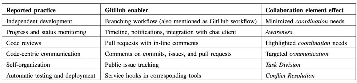 Fig. 2 shows a table of practices and what GitHub features enable them. The right-most column shows the effect the practice has on collaboration.